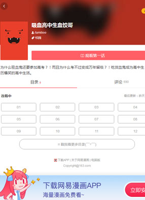 简介: 《吸血高中生血饺哥》漫画简述:有这么一个吸血鬼,寿命长到无聊,所以在某天,他去念了一所学校,可是,从学校建校起就一直在念,一直念到他的同学都有好几个轮着做了学校的校长,他还没有从学校毕业。每个去到这所学院的人都知道,学院里有个万年留级的血饺哥,一定一定不能去招惹,不然,可是会被吸干的哦~